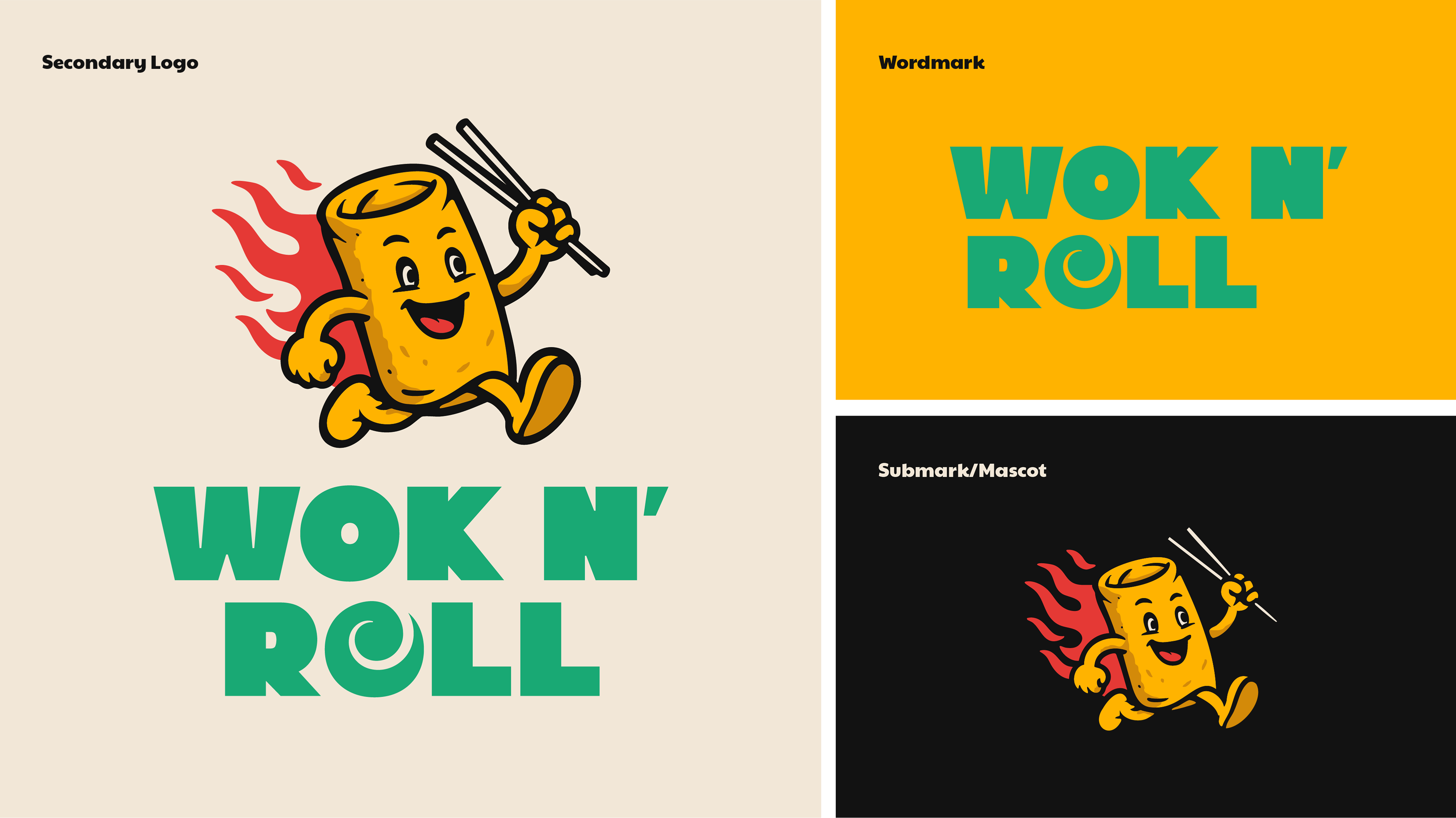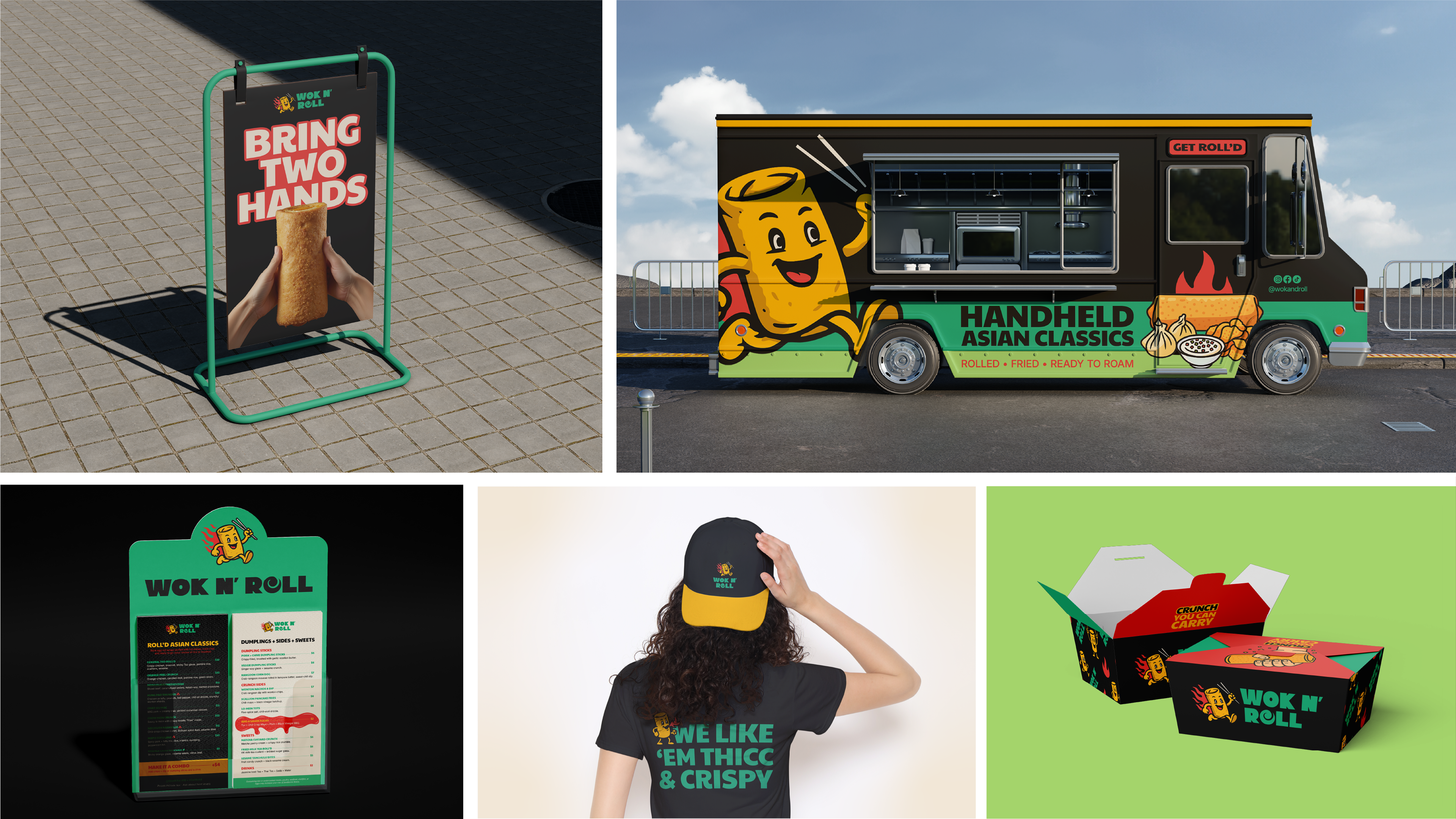 Wok n’ Roll reimagines takeout classics as crispy, handheld street food, giant egg roll burritos, dumpling sticks, and sauce-packed sides. I built the visual identity from the ground up to feel fast, fun, and unmistakably craveable. From the punchy mascot to the custom icons and truck wrap, the brand balances cheeky food-truck fun with clean, consistent design that scales from menus to merch.