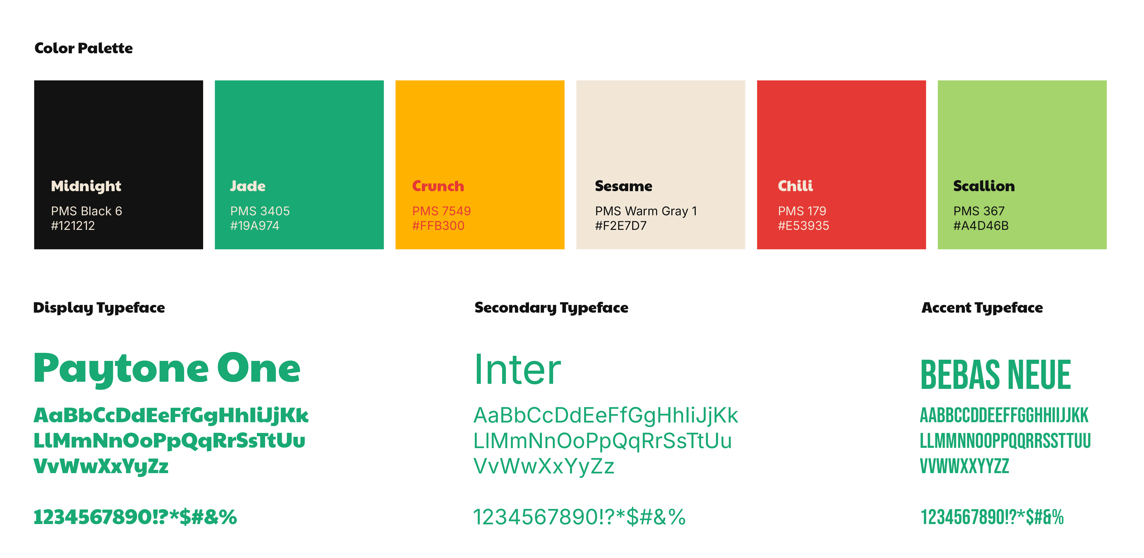 A bold, high-contrast palette balances craveable warmth (Crunch, Chili, Sesame) with confident pops of cool (Jade, Scallion, Midnight). Strong, friendly typefaces—Paytone One, Inter, and Bebas Neue—keep everything readable and high-impact on truck exteriors and menus.